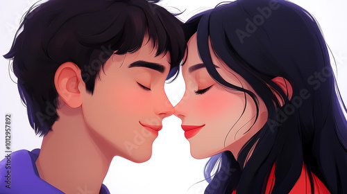 A young couple with their eyes closed, about to kiss.