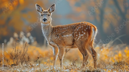 A young deer standing gracefully in a forest clearing surrounded by autumn foliage during a tranquil morning light