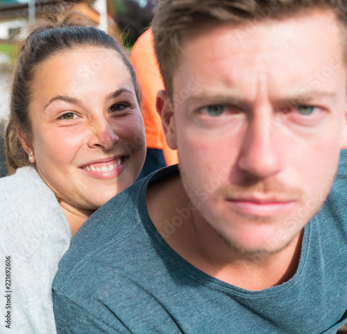 a young dominant boyfriend leans forward and protects his attractive girlfriend sitting behind him