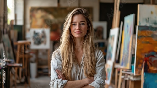 A young European woman with long blonde hair stands confidently in an art studio, surrounded by vibrant paintings. Her relaxed demeanor and warm smile reflect a creative spirit.
