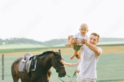 A young family have a fun in the field. Parents and child with a horse