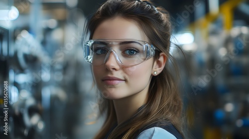 A young female engineer with safety glasses looks directly at the camera in an industrial setting.