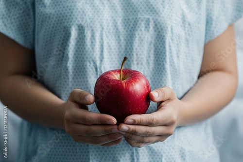 A young female in a hospital gown holds a bright red apple, symbolizing health and vitality. Recovery and Nutrition, Vitality Amid Illness