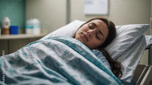 A young female patient peacefully sleeping in a hospital bed, covered with a blanket, in a calm and clean medical environment.