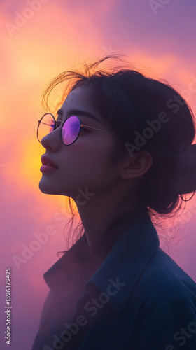 A young female silhouette blends with soft lighting and vibrant cloudscape, creating a dreamlike fusion that symbolizes emotional depth, inner peace, and surreal connection to the modern world.