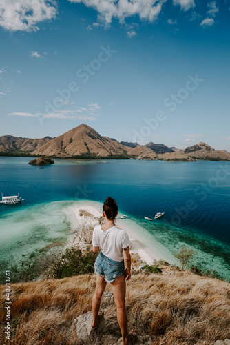 A young female traveler is exploring tropical island in Komodo, Indonesia. She is wearing a casual outfit and overlooks lagoon bag, boat and hills in the distance
