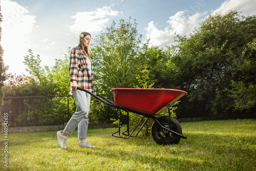 A young gardener is carrying a metal garden cart through his beautiful green blooming garden. A professional gardener is carrying a wheelbarrow, Sunny autumn day.