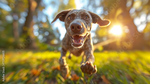 A young German Shorthaired Pointer dynamically running, seen from the front and slightly below. In the background a park, strong motion blur. Bright summer light.