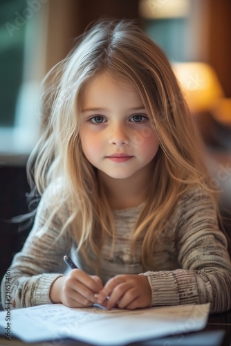 A young girl deeply focused on her creative drawing at home, showcasing her remarkable talent and imagination