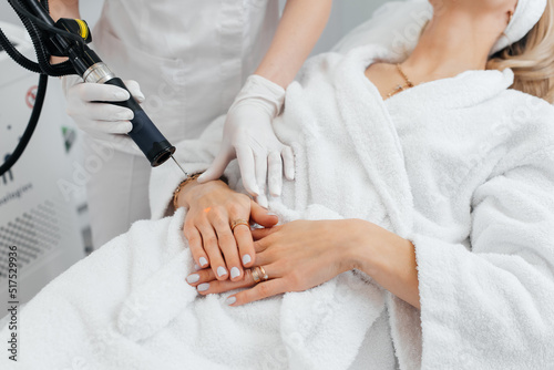 A young girl gets carbon peeling for the skin of her hands in a beauty salon. Laser pulses cleanse the skin. Hardware cosmetology. The process of photothermolysis, warming the skin.