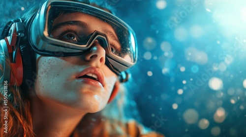 A young girl immersed in a virtual reality world, wearing VR goggles and headphones, capturing the essence of technology and the future of human experience and interaction.