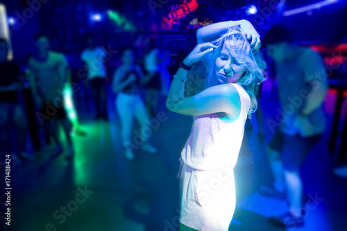 A young girl in a pink dress is dancing in a club