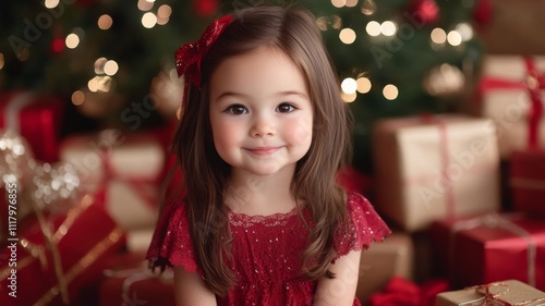 A Young Girl in a Red Dress Smiles in Front of a Christmas Tree