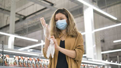 A young girl in a supermarket puts on a protective medical mask and rubber gloves to protect against infection with the coronavirus.