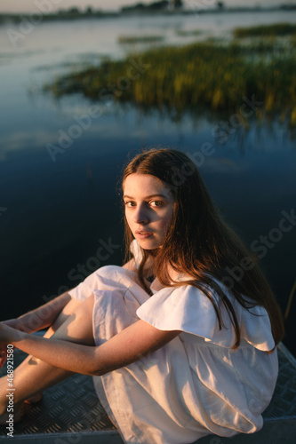 a young girl in a white dress sits on a boat at dawn and looks thoughtfully at the camera. summer holidays