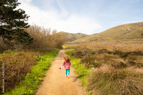 A young girl running on a hiking path outdoors in nature on a sunny day.