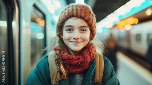 A young girl smiles brightly while waiting for the train at a subway station, capturing the warmth of friendliness in an urban environment filled with color and light.