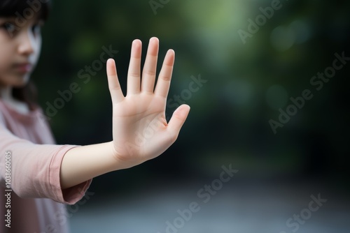 A young girl stretches out her hand to protest against domestic violence and discrimination, emphasizing the need for awareness and change