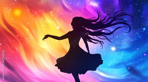 A young girl twirls in a cosmic ballet, surrounded by twinkling stars and swirling galaxies, celebrating the universe.