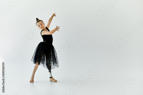 A young girl with a prosthetic leg performs a graceful ballet pose.