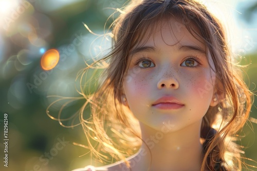 A young girl with big, expressive eyes looks upwards in natural sunlight with a curious gaze