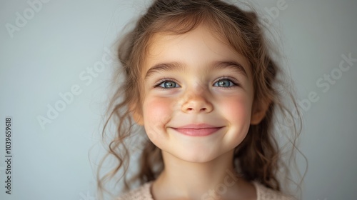 A young girl with long hair and blue eyes is smiling