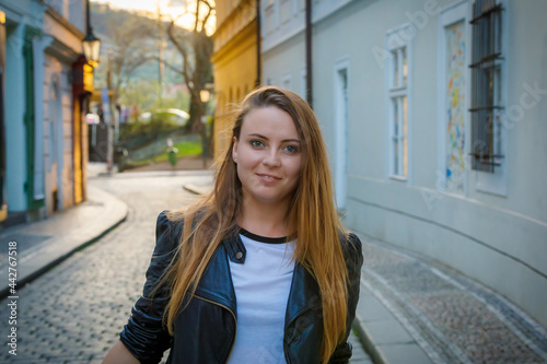 A young girl with long hair is walking along the city street. The road is paved with cobblestones.