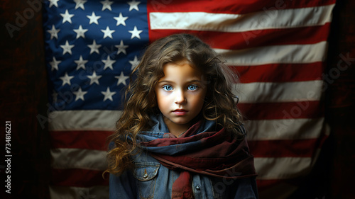 A young girl with striking blue eyes stands before an American flag, her expression thoughtful, symbolizing hope and the future of the nation.AI generated.