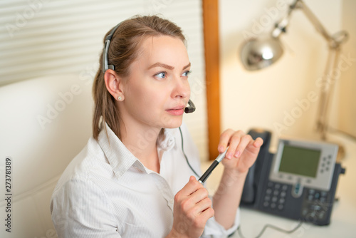 A young girl works in a call center. for a working place. . earphone and microphone. Support service. Help desk. Horizontal photo