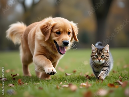A young golden retriever puppy dog running and playing with a cat happily in the park