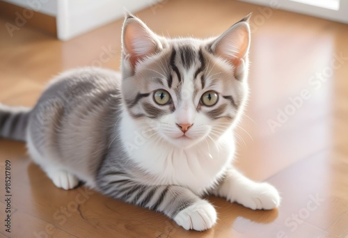 A young gray and white tabby kitten sitting on a wooden surface, looking up with large curious eyes