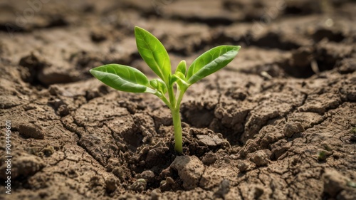 A young green plant sprouts from cracked soil, symbolizing hope and resilience in a dry landscape.