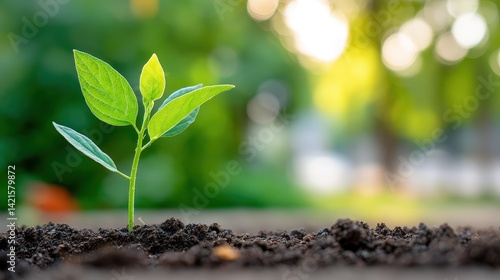 A young green plant sprouts from rich soil, symbolizing growth and renewal in a bright, natural setting.