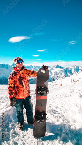 A young guy in ski equipment is standing with a snowboard against the background of a panorama of a snowy mountain range. Young snowboarder high in the mountains