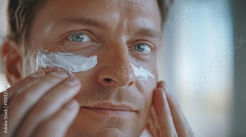 A young male applies skincare cream to his face, focusing on nourishing his skin in a well-lit room. Man applying skincare cream in bright indoor setting during morning routine.