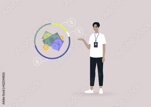 A young male Asian financial consultant pointing at the investment program infographics, an online professional advice service