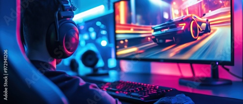A young male gamer is playing inside a computer video games racing car background wallpaper AI generated image