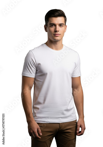 A young male model, early 20s, lean build, dark hair, wearing a white t-shirt and light brown chinos, against a stark black studio background with uniform lighting, displaying apparel for product