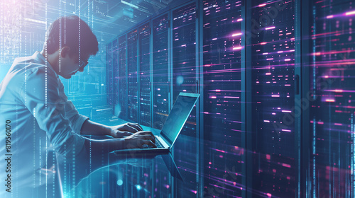 A young man server room, a computer engineer is deeply immersed in their work, the engineer's laptop displaying intricate network diagrams and performance metrics.