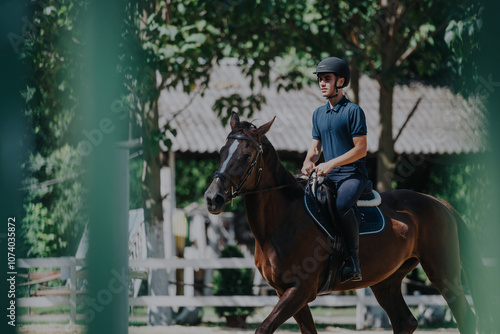 A young man confidently rides a horse during an outdoor equestrian training session, surrounded by lush greenery. He wears protective riding gear, showcasing his passion for horse riding and