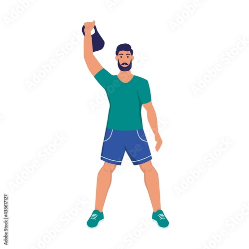 A young man does exercises with a kettlebell. Sports at home, healthy lifestyle. Flat cartoon vector illustration.