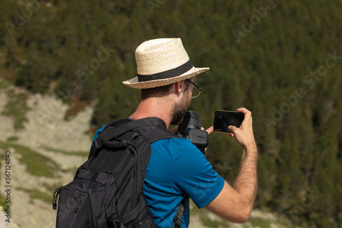 A young man enjoys taking photos in nature on his way to the cold summit of Moncayo, the highest mountain in the Iberian System, in the Tarazona region of Aragon, Spain.