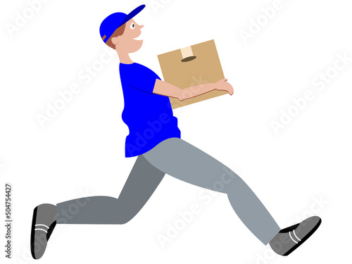 A young man in a blue baseball cap and t-shirt runs fast and holds a large box in his hands isolated. Concept - express delivery service