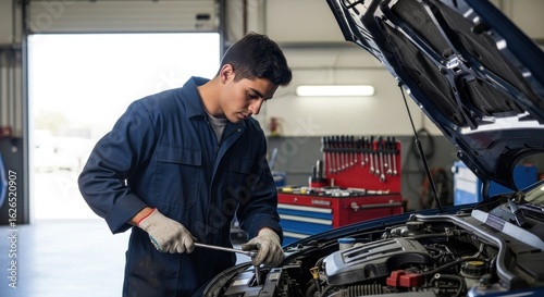A young man in a blue coverall and gloves working on a car engine in a workshop.