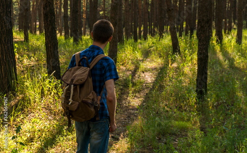 A young man in a blue plaid shirt and a backpack walks through the coniferous forest