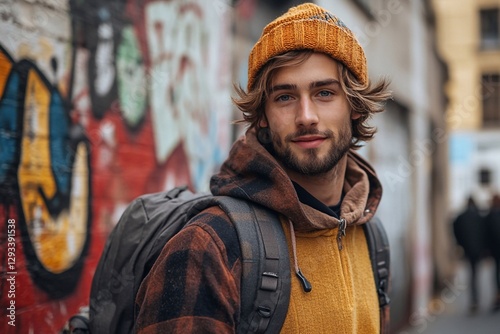 A young man in casual sportswear with a fashionable backpack, posing on a skateboard near graffiti.