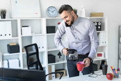 A young man in the office is standing near the table, holding the phone with his shoulder, looking at the monitor and pouring coffee into the cup.