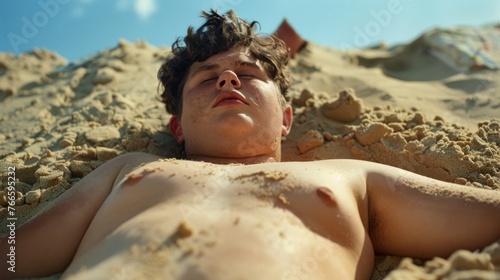 A young man laying on top of a sandy beach. Perfect for travel and leisure concepts