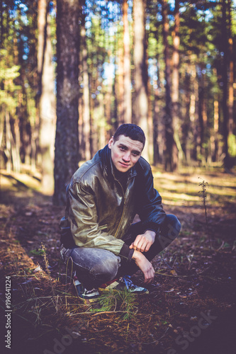 A young man of criminal appearance in a black leather jacket posing in an autumn forest.