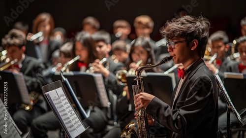 A young man plays a saxophone in a band. The other members of the band are also playing instruments